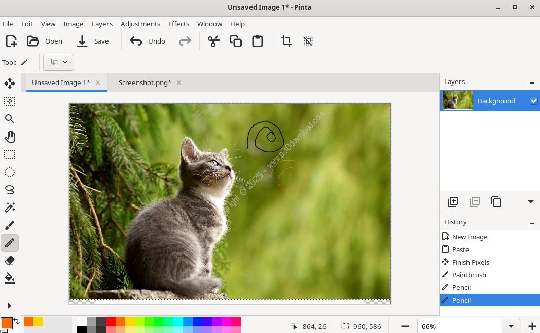 Pinta is a free, open-source program for drawing and image editing. It combines intuitive tools with powerful features, making it easy to create, enhance, and manipulate images. Whether you're sketching or retouching photos, Pinta keeps things simple without sacrificing functionality. Compared to Microsoft Paint, Pinta includes more features, such as support for layers and multiple undo levels. While it’s not as powerful as GIMP or professional tools like Adobe Photoshop, it strikes a good balance between simplicity and functionality for everyday image editing.