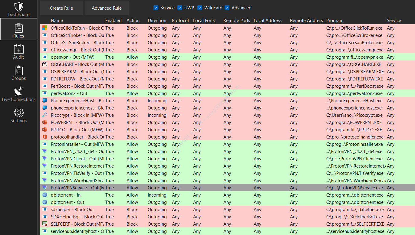 - پشتیبانی از قوانین Wildcard مدیریت آسان برنامههایی که مکرراً بهروزرسانی میشوند (مانند مرورگرها)، با ایجاد قوانین کلی برای هر نسخه در یک پوشه خاص
