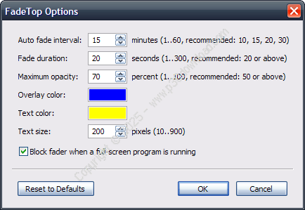 FadeTop's purpose is twofold. It is designed to help people relax their eyes by reminding them to take a break once in a while and, at the same time, be as unobtrusive as possible. As such, the application is very easy to install, simple to configure and places very little strain on the computer's resources.