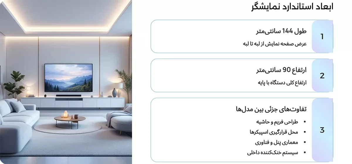 تلویزیونهای 65 اینچ الجی از نظر ابعاد فیزیکی در محدودهی 145x83 سانتیمتر قرار میگیرند و برای فضاهای 30 تا 40 مترمربع ایدهآل هستند. رعایت فاصلهی دید 2 تا 2.7 متری و انتخاب براکت مناسب بر اساس VESA، دو عامل کلیدی برای دستیابی به تجربهی دید بینقص هستند.