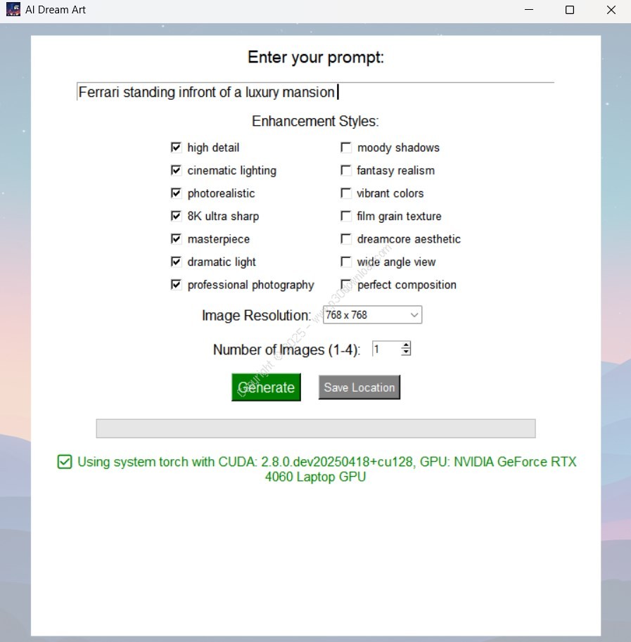 Unleash your imagination and generate breathtaking AI art right on your desktop — with zero internet dependency. AI Dream Art is your private, offline creative studio powered by a local diffusion model. No sign-ups, no cloud processing, and no usage limits.