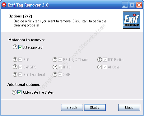 Exif Tag Remover allows you to easily delete all metadata tags. By doing so before publishing an image you take an active step toward protecting your privacy on the Internet!