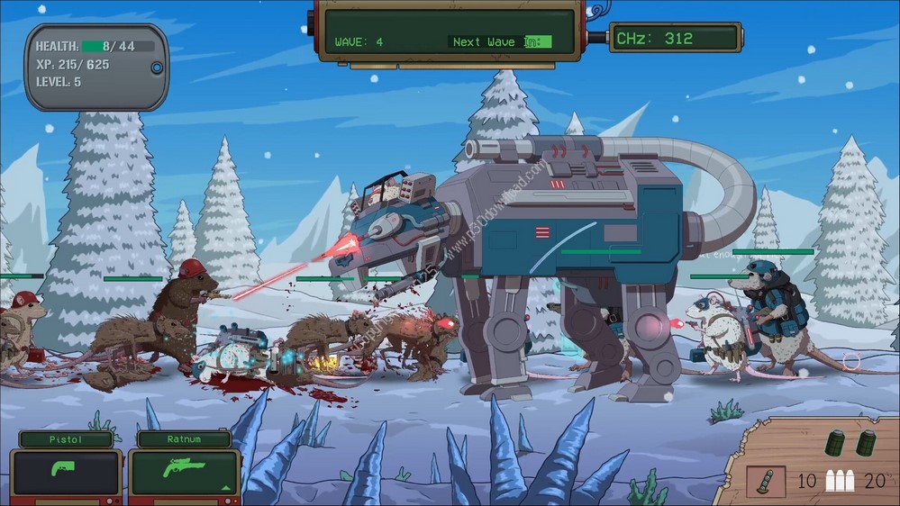 This game is a 2D roguelite side-scrolling shooter mixed with tower-defense and RPG elements, set in a world inhabited only by rats. You lead a rat army to reclaim Ratopia from TechnoRat, a hive mind of cyborg rats. Featuring hand-drawn art inspired by brutal 90s games, it offers fast, bloody action with tons of weapons, enemies, and loot. The game includes modes such as a full campaign, Horde, New Game+, base customization, and skirmish. Gameplay focuses on strategic combat, troop management, permanent upgrades, base building, and non-stop intense battles.