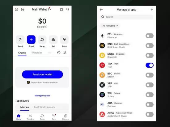 پس از نصب و راهاندازی اپلیکیشن، وارد صفحه اصلی تراست ولت شوید و روی «Manage Crypto» کلیک کنید. در بخش جستجو، عبارت «TRX» یا «Tron» را وارد نمایید تا بتوانید توکن ترون را به فهرست کیف پول خود اضافه کنید. با این کار، موجودی و تراکنشهای مرتبط با TRX بهصورت کامل نمایش دادهمیشود. تراست ولت از توکنهای اصلی شبکه ترون و استانداردهای مربوط به آن پشتیبانی میکند.