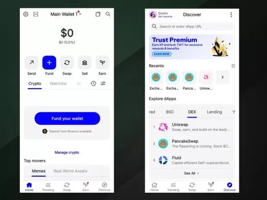 برای خرید ترون بهصورت مستقیم، در پایین صفحه اصلی، روی تب «Discover» بزنید. از منوی وسط صفحه، «DEX» را انتخاب کنید تا فهرست صرافیهای غیرمتمرکز به شما نمایش دادهشود. بعد از انتخاب پلتفرم مناسب مثل SunSwap، کیفپول تراست ولت خود را از طریق WalletConnect به dApp متصل کنید.