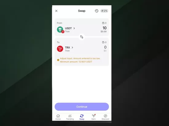 سپس توکن مبدا و مقصد را انتخاب کرده، مبلغ مورد نظر را وارد کنید، میزان لغزش قیمت (Slippage) را تنظیم و عملیات سواپ را تأیید کنید. فراموش نکنید که پیش از انجام معامله، حداقل ۵۰ TRX در کیفپول خود داشتهباشید تا هزینههای مربوط به انرژی و پهنای باند شبکه ترون را پوشش دهد.