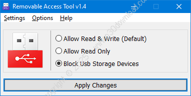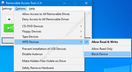 - منوی Options شامل ویژگیهایی برای مسدود کردن یا رفع مسدودیت درایوهای قابل جابجایی و اجازه یا رد دسترسی است