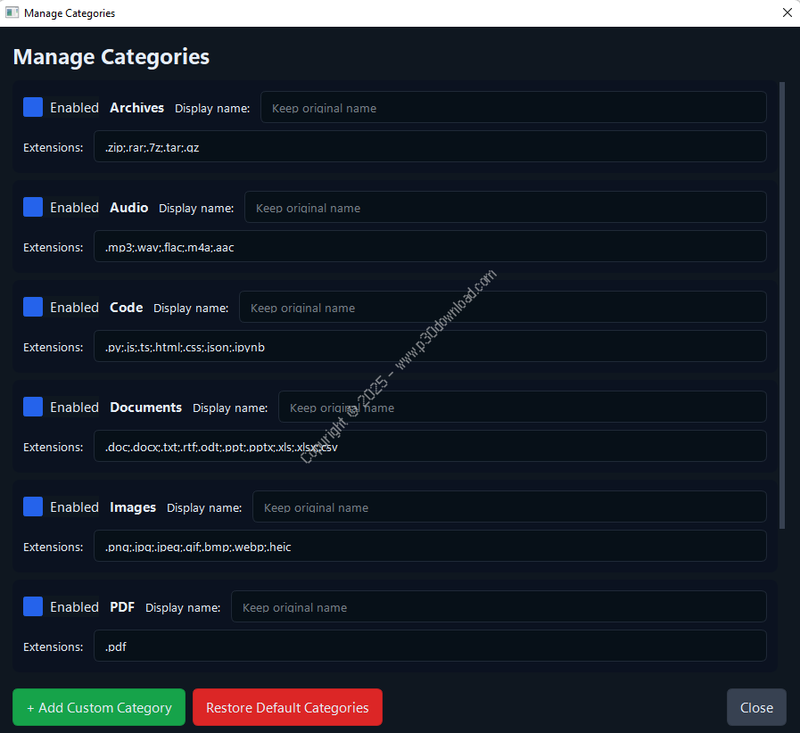 - قابلیت نامگذاری سفارشی دستهبندیها (Custom Category Names) برای تغییر نام پوشههای دستهبندی داخلی (در حالت مرتبسازی ساده)