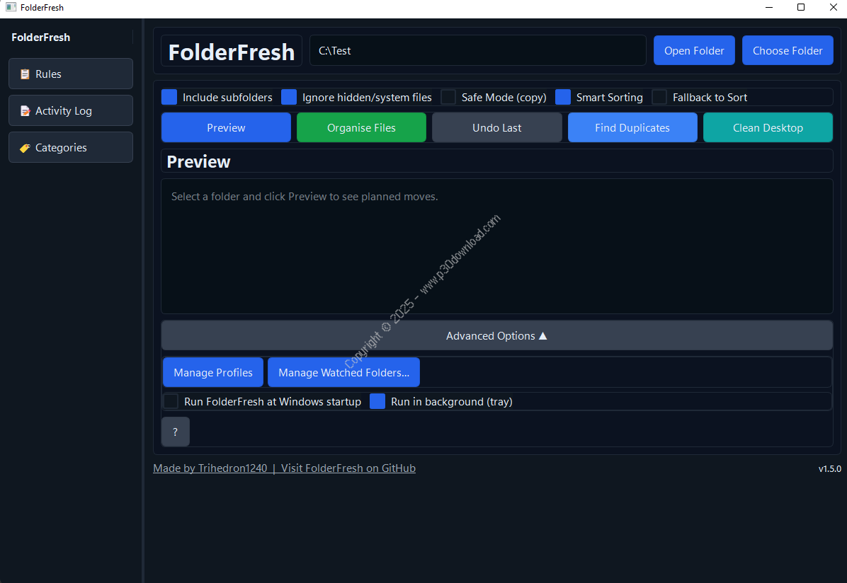 FolderFresh is an innovative application explicitly designed to efficiently declutter and organize messy digital folders by automatically sorting files into neatly categorized sub-folders. This tool is essential for users dealing with disorganized download folders or frequent file management tasks, as it allows them to organize files into logical categories like Documents, Images, Videos, and Audio with just a single click, significantly improving file access and system efficiency.