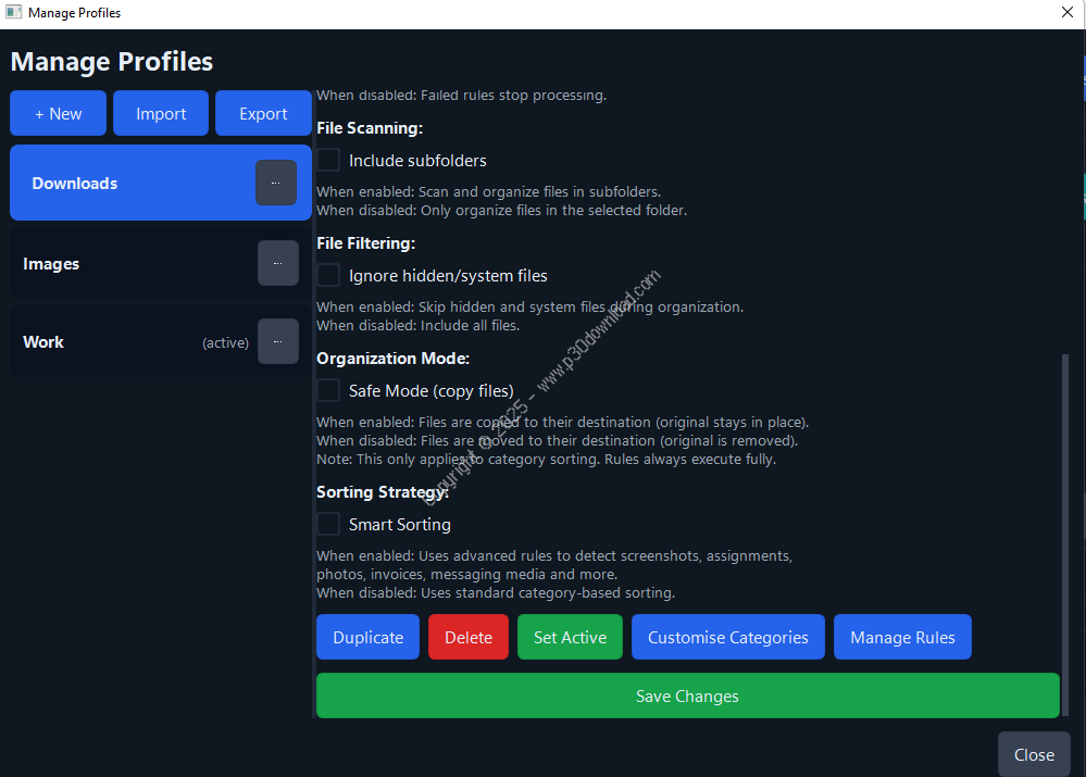 - انجام مرتبسازی خودکار فایلها در پوشههای دستهبندی داخلی مانند اسناد، تصاویر، ویدیوها، صداها، آرشیوها، کدها و موارد دیگر
