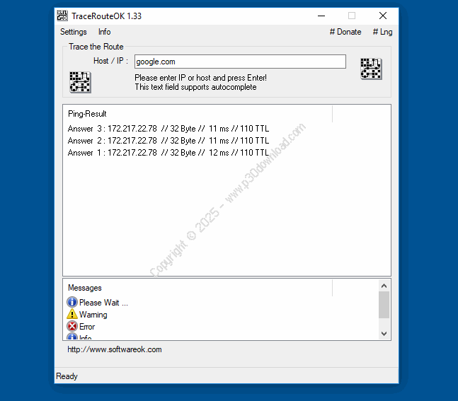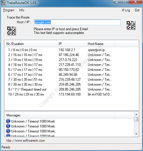TraceRouteOK is a freeware application designed to track and visualize the path that data takes across the World Wide Web, the broader internet, or a local network. Its core purpose is to provide users with a quick and efficient list detailing the data route, essentially offering a streamlined alternative to other, potentially slower trace route programs.