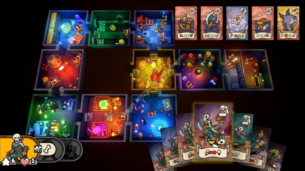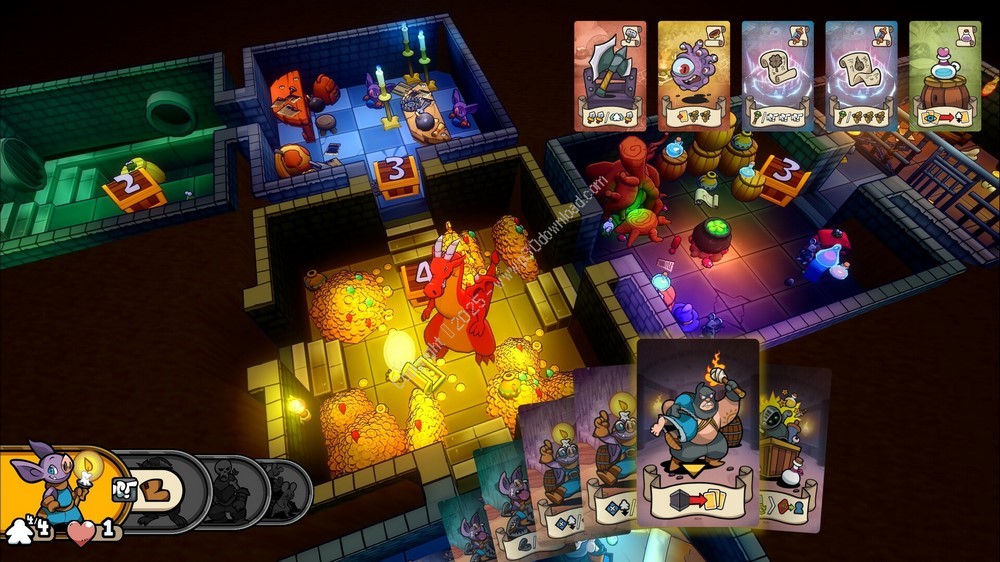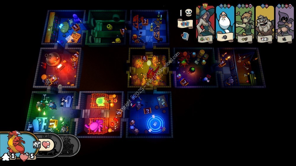 Keep the Heroes Out is an asymmetric, cooperative dungeon defense game for 1-4 players where players take on the roles of monsters protecting their treasures from invading heroes. Each player chooses a monster with unique abilities and starting cards. During their turn, players use cards to perform actions, which can be split among multiple monsters. Monsters can die, but they can always be brought back to the dungeon, though stolen treasure is lost forever. The goal is to protect the treasures for as long as possible; if players lose their vault’s hoard at any point, they lose the game. Each level features different dungeon layouts and special rules to enhance gameplay.