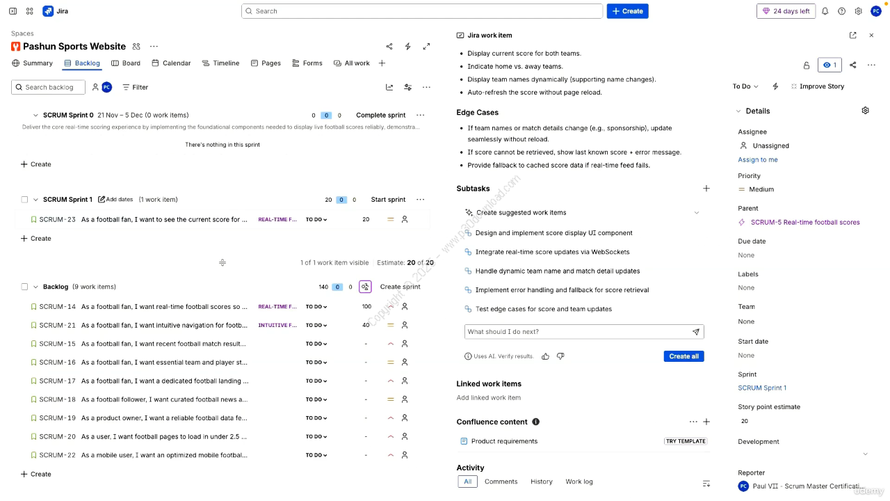 This course contains the use of artificial intelligence.Unlock the power of AI in modern agile delivery with this practical, hands-on course designed to transform Scrum Masters, Project Managers, Product Managers, and anyone aspiring to step into these high-demand roles. AI for Scrum Masters & Agile AI Project Managers shows you exactly how to use GenAI tools — including ChatGPT, Jira AI, Confluence AI, Rovo AI, and Fireflies . AI — to dramatically accelerate your productivity and stand out in today’s competitive job market.You’ll learn how to use ChatGPT with effective prompt engineering to create product goals, refine user stories, build product backlogs, generate acceptance criteria, and support sprint planning with data-driven clarity