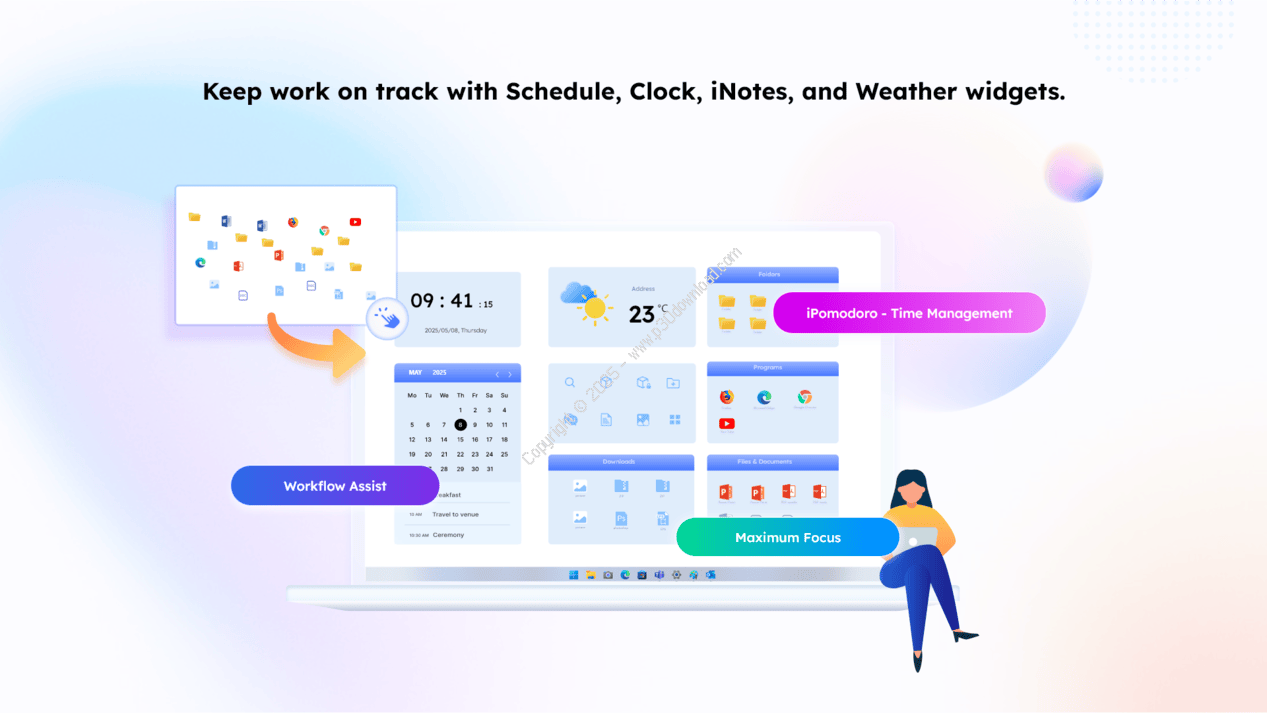 - شامل ابزارک یادداشتهای چسبان (Sticky Notes) برای ثبت افکار سریع و ساعت روی صفحه