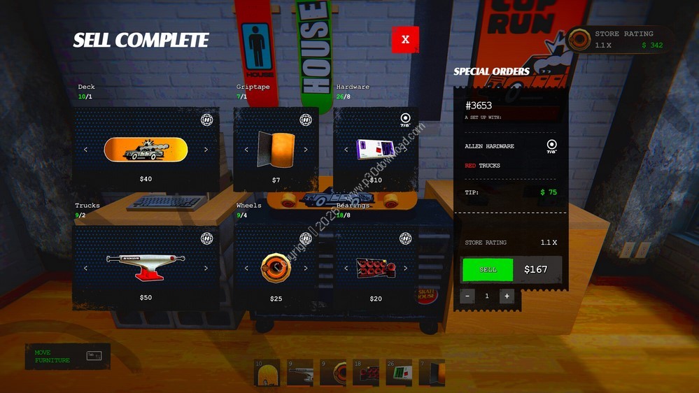 Skatehouse is a small skate shop simulator where you design, manage, and grow your own skate shop. In the game, you can manufacture different skate parts, combine them into complete boards, and sell them to customers, manage your shelves, improve your supply chain, and expand your business by hiring staff and sponsoring local skaters. The game offers roughly 4–5 hours of enjoyable gameplay focused on shop management rather than big environments or active customers.