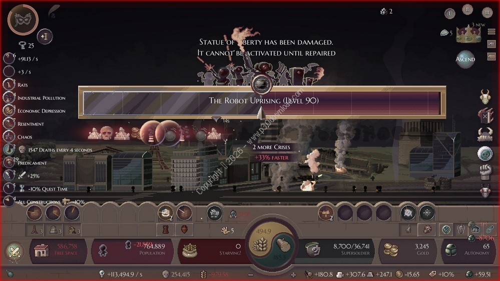 Microcivilization is an engaging strategy clicker and resource management game that lets you grow a tiny civilization from scratch, expanding its economy, army, and heroes while making choices that affect ethics and development. As you progress, you unlock new technologies, manage crises such as wars, disease, and civil unrest, and strategically use your heroes’ abilities to guide your society through different historical eras. Every crisis you overcome strengthens your civilization and opens up new paths for advancement.