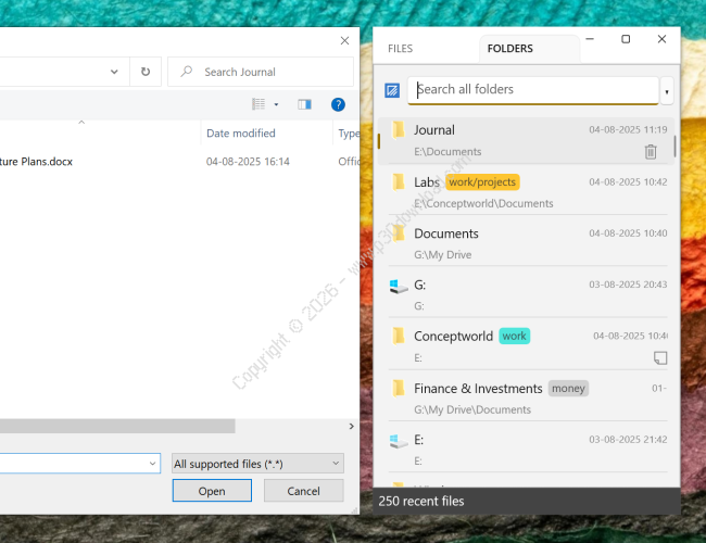 - ادغام با پنجرههای باز کردن/ذخیره کردن (Open/Save) ویندوز جهت پرش آنی به پوشه مورد نظر